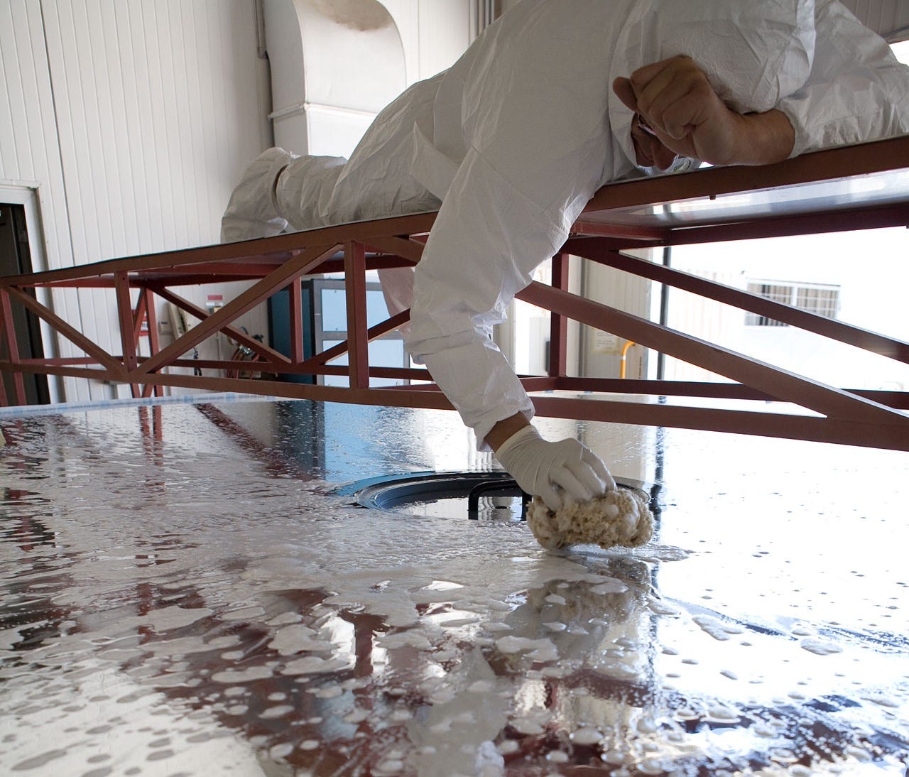 Engineers carry out this process once a week. Then, every six months, the mirror is completely removed for a biannual sponge bath.